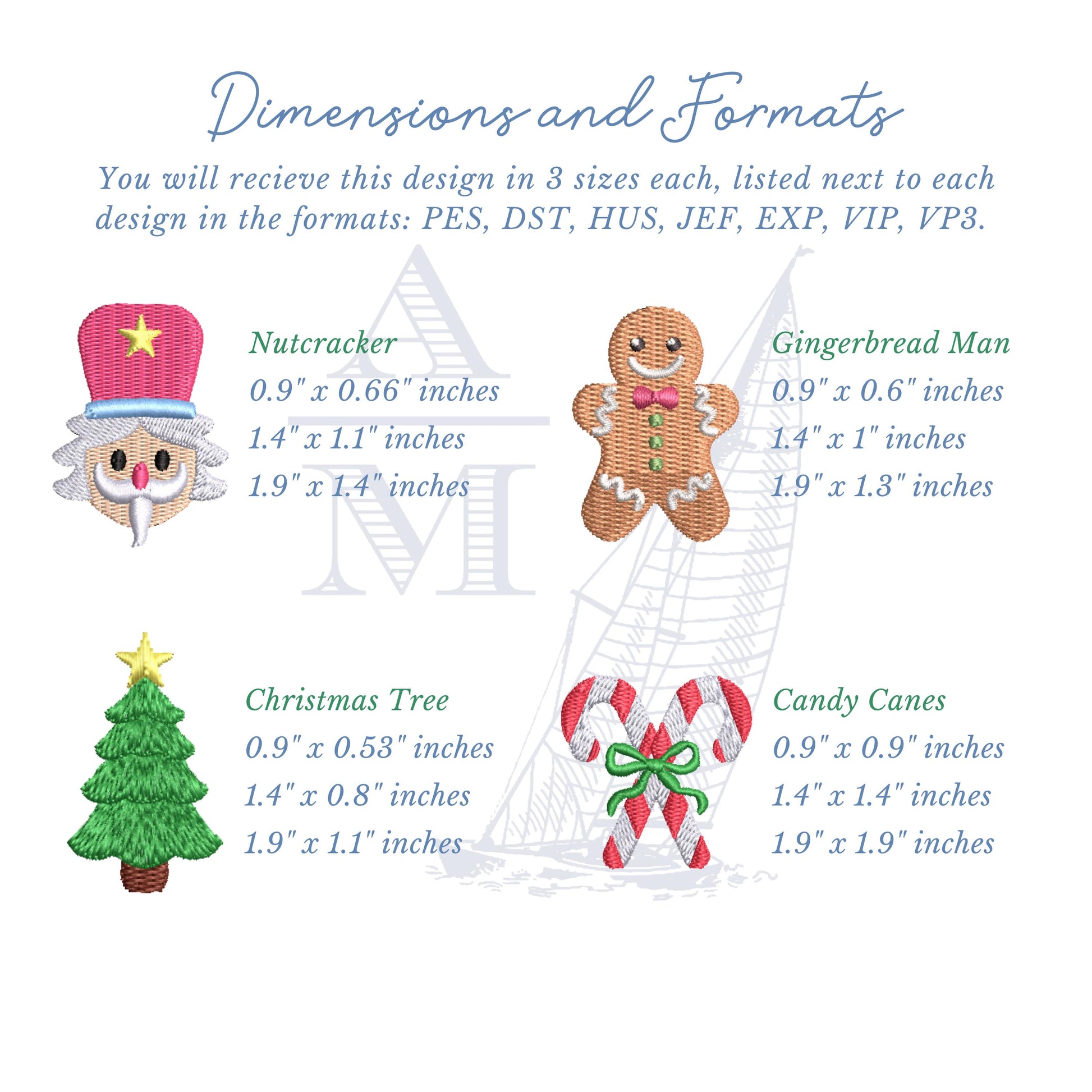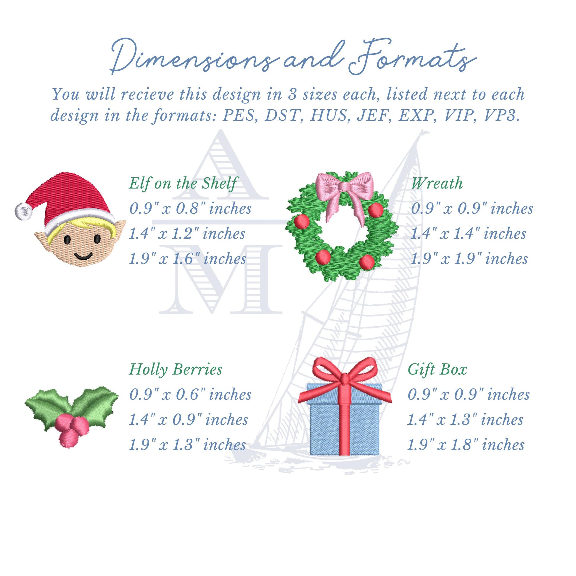 Grab this adorable mini Christmas holiday embroidery designs set pack, perfect for any of your holiday projects. Embellish any holiday project with this carefully, hand digitized yuletide designs that work beautifully with a monogram font, script embroidery font or alone or with others in the set. Create your own unique design with this complete set! You will receive 3 sizes each of the designs with dimensions listed below.
