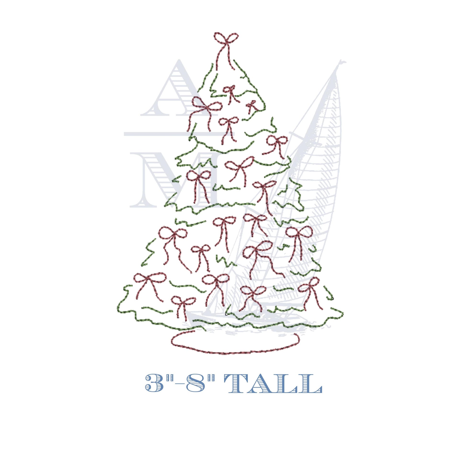 Add some girly Christmas cheer to your projects with this hand drawn Christmas tree with bows embroidery design. The tree skirt, tree branches and bows are color separated for easy customization. Dimensions listed below!