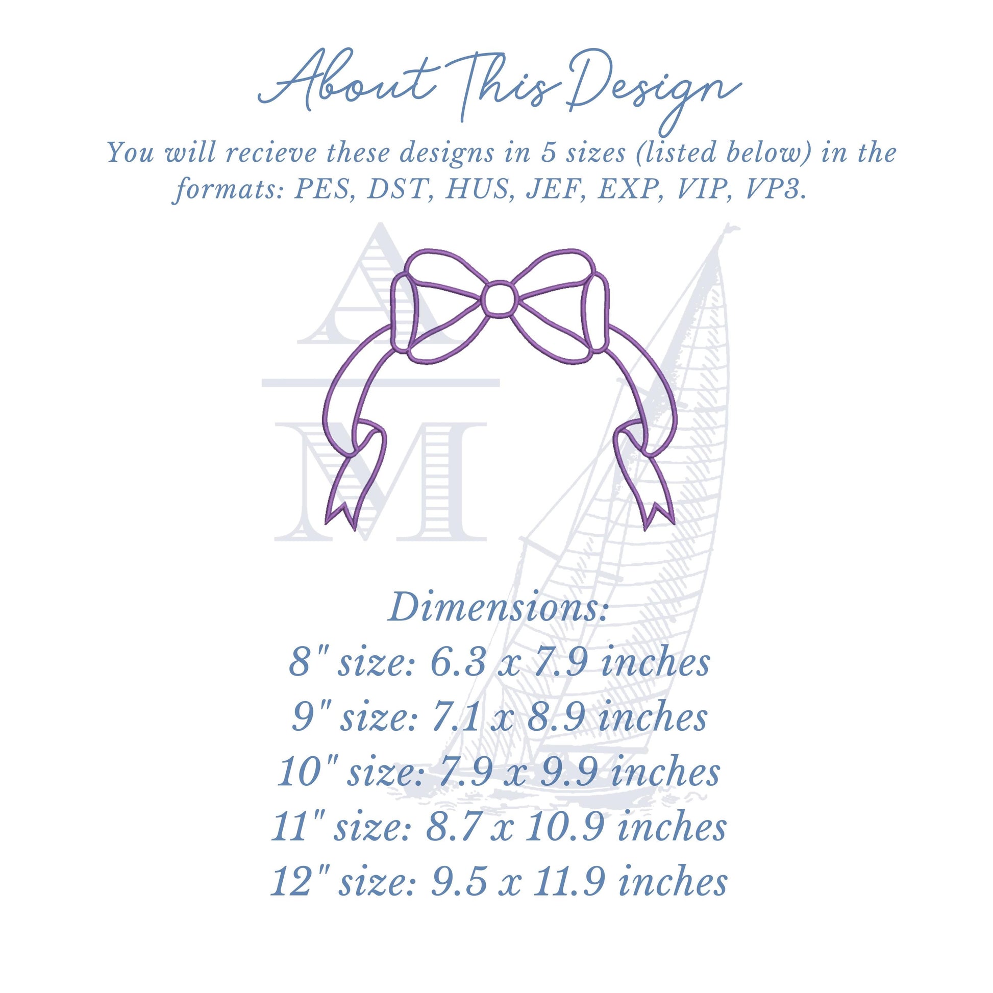 This extra large satin finish bow applique design is perfect for home decor projects like bed pillows, boudoir pillows, duvet covers, sheet sets and more! You will receive these designs in 5 sizes (listed below) in the formats: PES, DST, HUS, JEF, EXP, VIP, VP3.