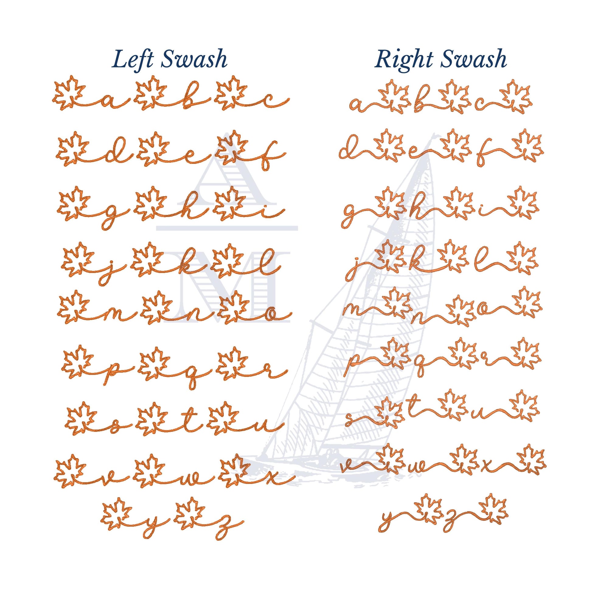 Happy Fall Y‘all! Pick up this font for all of your fall, Halloween or Thanksgiving embroidery projects. Carefully digitized in three different sizes, 0.5", 1" and 2" tall. You will receive 3 fonts per size--the left swash, main alphabet and right swash. The font is designed to include leaves on the left and right side of words or phrases. You can also use the full alphabet without the leaves, as it includes upper and lowercase letters. Use on a wide variety of items to add a touch of autumn style including tote bags, towels, sweaters or even blankets.
