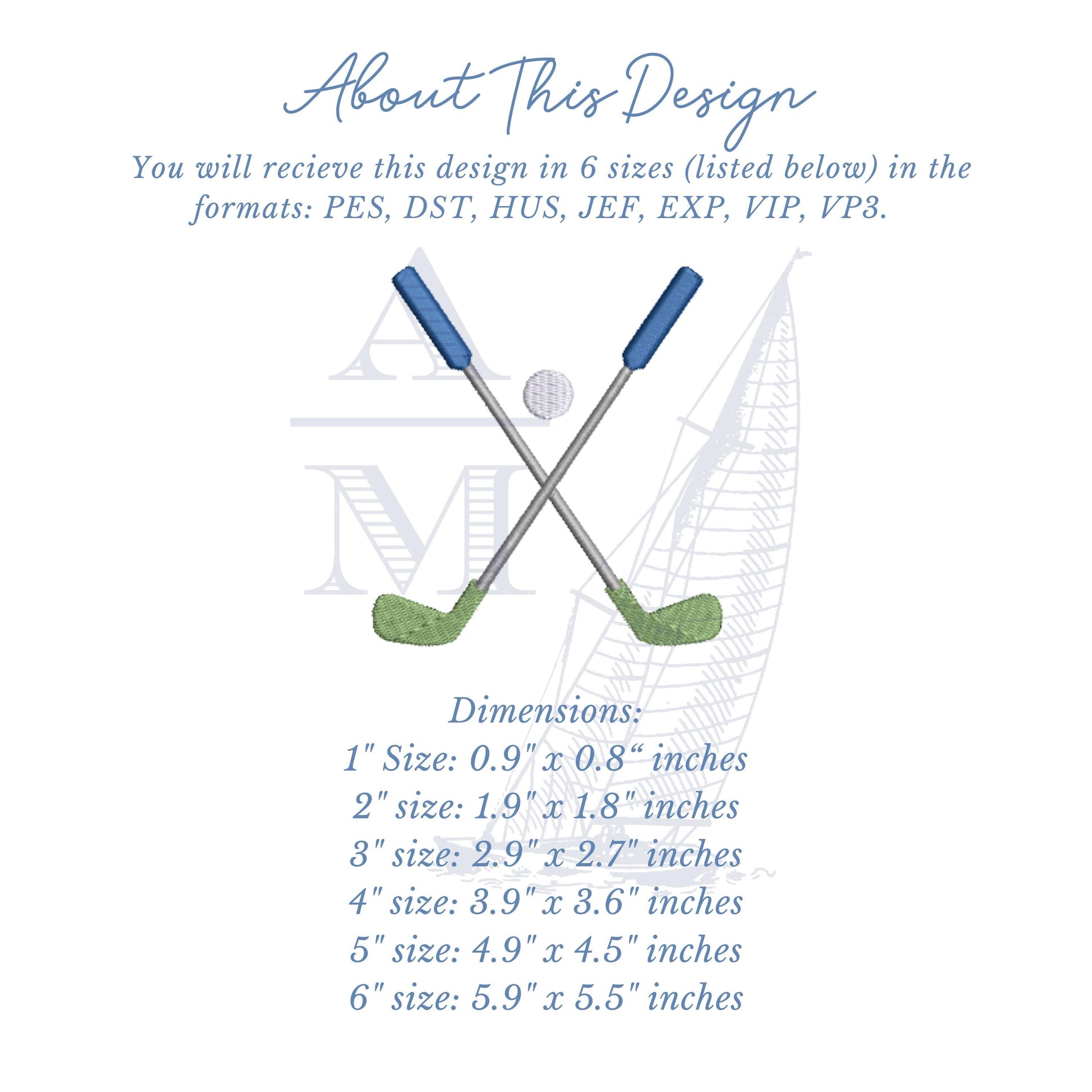 Get ready for golf season and personalize your favorite golf apparel pieces like polos, visors, hats, golf towels with this golf club embroidery design that can be used alone or with initials on either side of the clubs. Perfect for any Masters embroidery project, hole in one party, and so much more! Font not included. You will receive a digital file in a zip format in the below sizes: