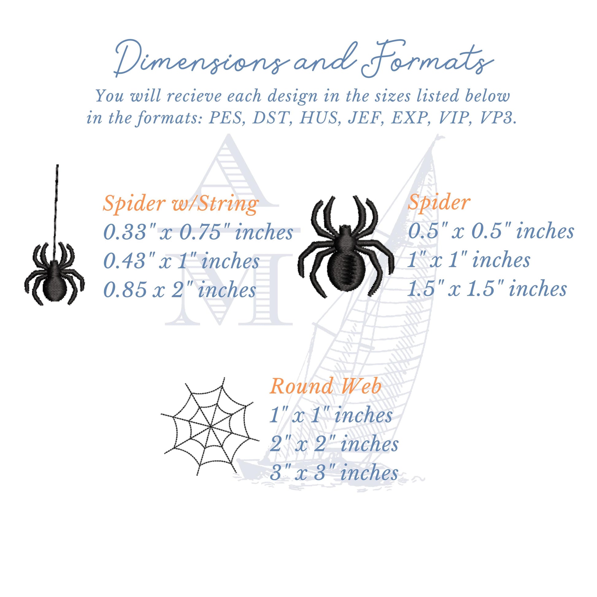 New for Fall 2024! This super versatile Spider embroidery designs is great for any fall or Halloween design project. Add the motifs to a name for a custom font look, use alone or add on to monogram fonts or appliques. The spider frame works perfectly with your favorite spooky season text or name. Embellish any Halloween or fall project with these carefully, hand digitized spooky season designs that all work together to create a cohesive design either by themselves or mixed together. Create your own unique design with this complete set! You will receive 3 sizes each of the designs with dimensions listed below.