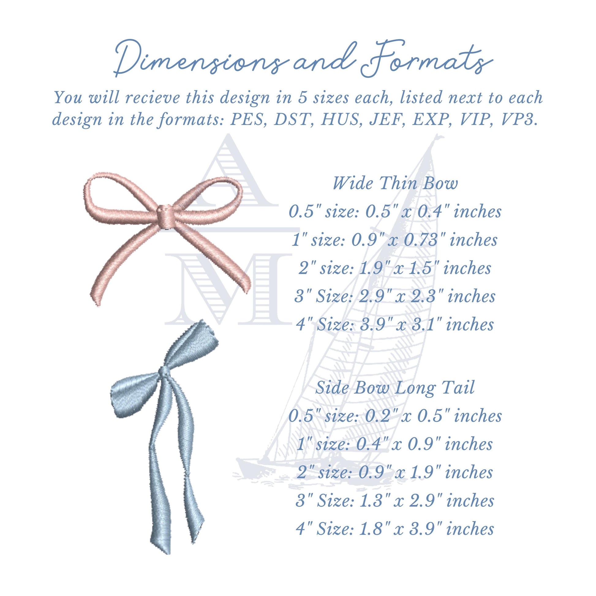 Add these adorable satin finish bows to your embroidery design collection today! 4 new bow designs ranging from 0.5" to 4", dimensions listed below for each design. These bows are super versatile, and can be used for a wide range of projects. Add to a name or monogram for a baby gift, put some feminine flair to your Christmas embroidery projects and more...the possibilities are endless!