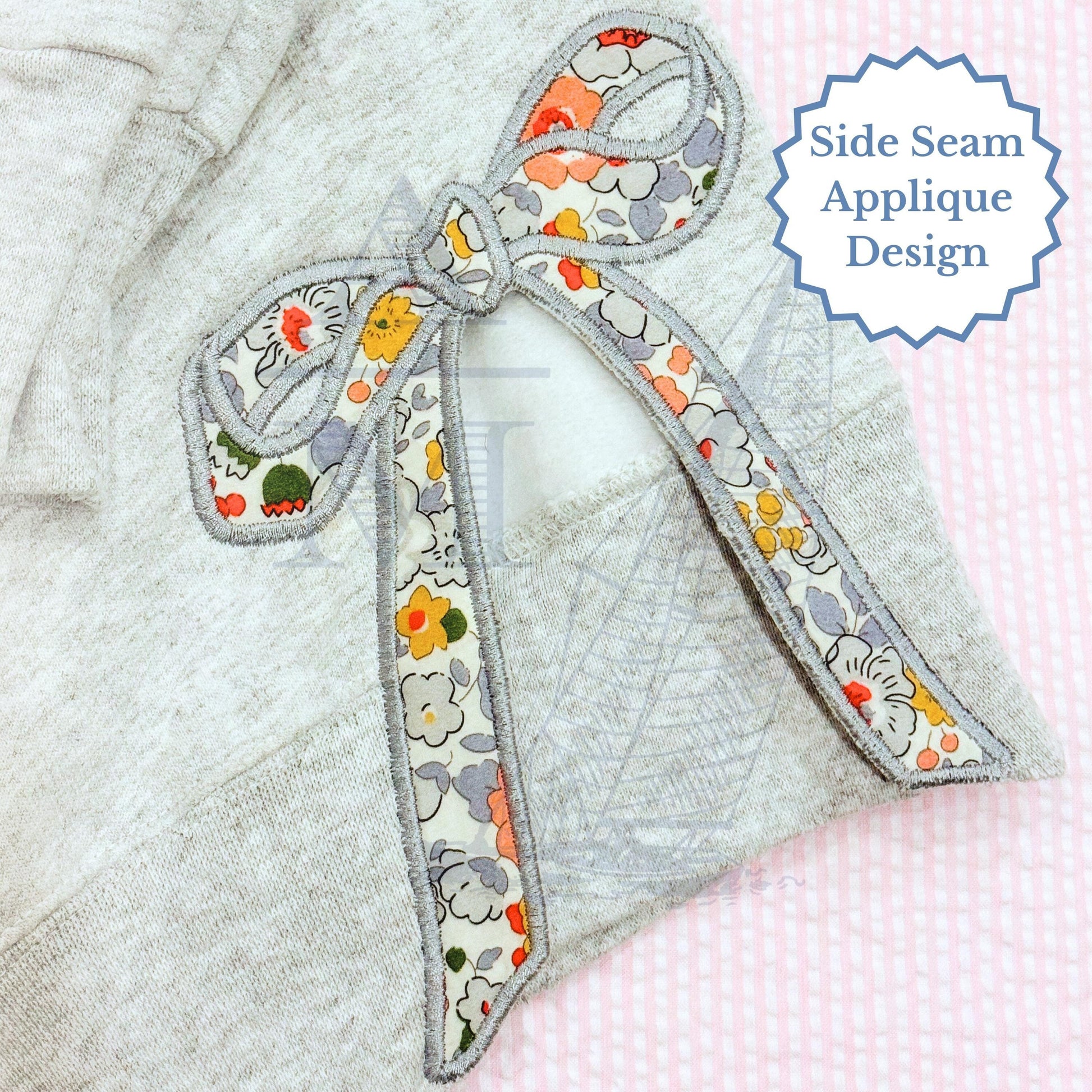 Add a trendy side bow applique to your favorite sweatshirt or sweater with my hand tied style bow applique with satin cover stitch. This design can be used as a regular applique or as a side seam embellishment. Use Christmas or holiday plaid fabric with this applique to add a seasonal touch.