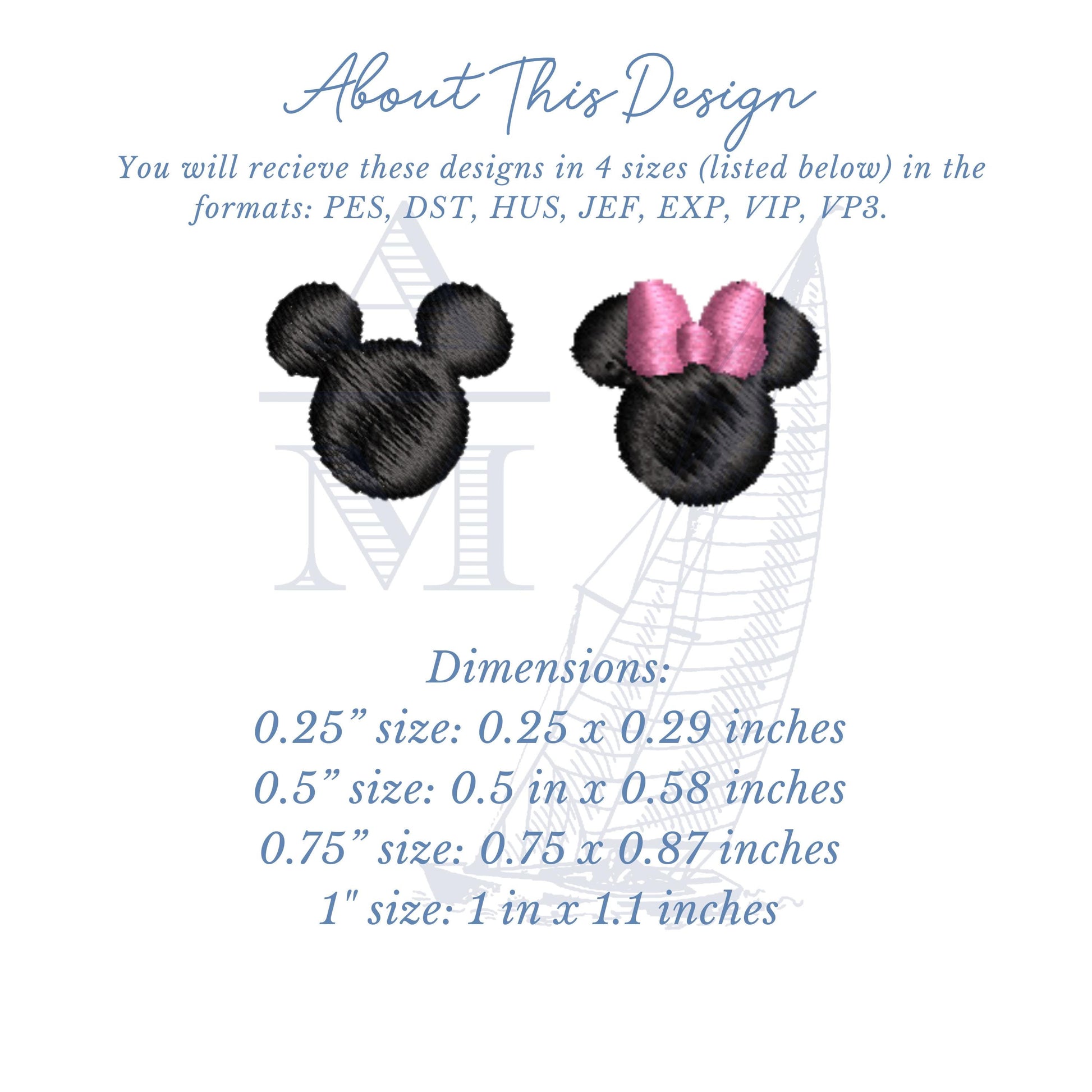 No trip to the most magical place on earth is complete without personalized shirts, hats...the works! Add these tiny mouse ear designs to your collection today. Designed to be used alone or with a monogram font or text font to add a bit of magic to your projects. Dimensions listed below. You will receive 2 sets, one for the boy mouse and one for the girl mouse.