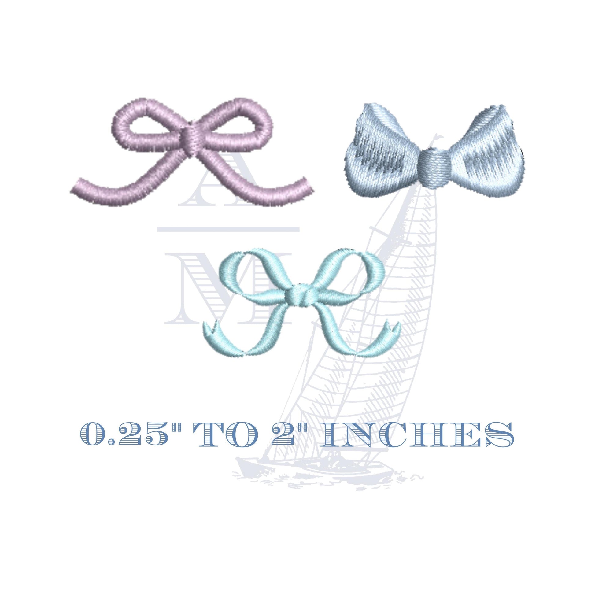 Add these tiny satin finish bows to your design collection! Ranging between 0.25" to 2" inches, depending on the design. Bow tie, curved up tail bow and thin satin bow, perfect to add on to names, monograms or existing motifs. Dimensions listed below.
